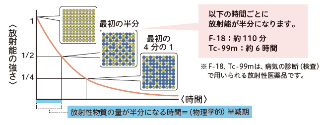 くすりに含まれるRIは物理学的半減期(放射能が半分になる時間)が短いという特徴があります。