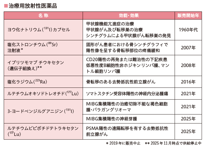 日本における治療用の放射性医薬品の始まりは、1960 年代に販売されたヨウ化ナトリウムです。その後、しばらく新たな治療用の放射性医薬品は発売されませんでした。しかし、2007 年に新しい薬が発売されたことを皮切りに、6種類の製品が発売されています(供給停止・販売中止の製品を含む)。さらに新しい薬の開発も進んでおり、近い将来利用可能になる予定です。なお、診断用の放射性医薬品は約45 種類の製品が販売されています。(2025年11 月現在)