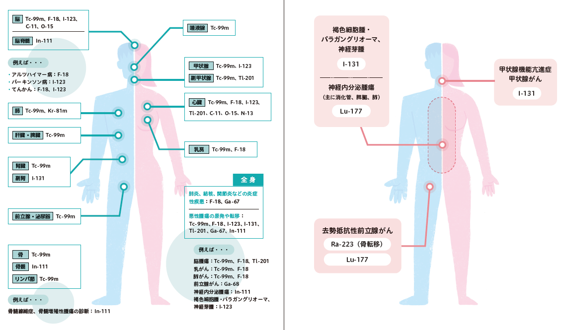 診断用のくすりが集まった場所から出る放射線を専用のカメラでとらえ、病気の場所の特定や臓器の働きや状態を調べることができます。