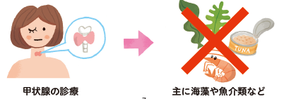 海藻類や魚介類(ヨードを含むもの)を一定期間ひかえる必要があります。食事制限は、病院ごとに細かい決まりがあります。主治医や医療従事者に相談してください。
