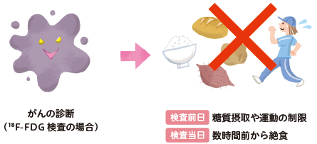 検査前に糖質(ごはん、パンなど)を取ったり運動したりすると、くすりががん細胞に集まりにくくなり、正しい結果が得られなくなります。