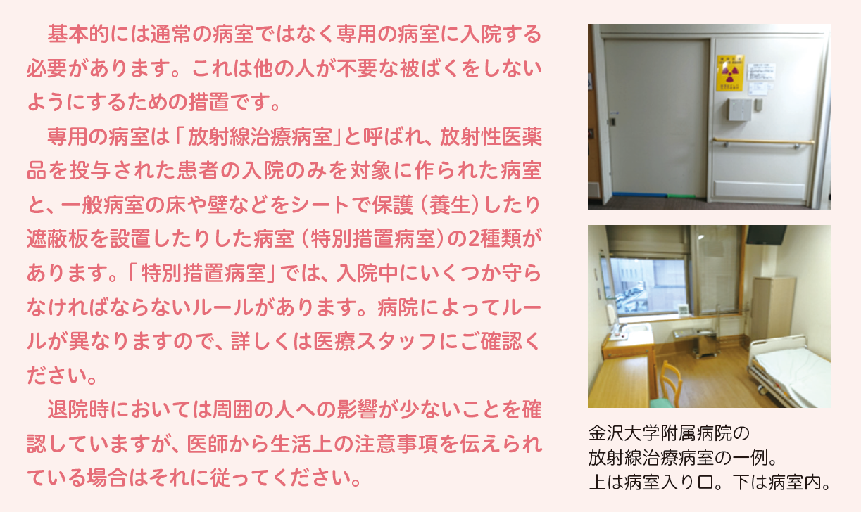 治療に使うくすりの種類によっては、体から出る放射線が周りの人に影響しないよう専用の病室(放射線治療病室)で過ごしていただく必要があります。